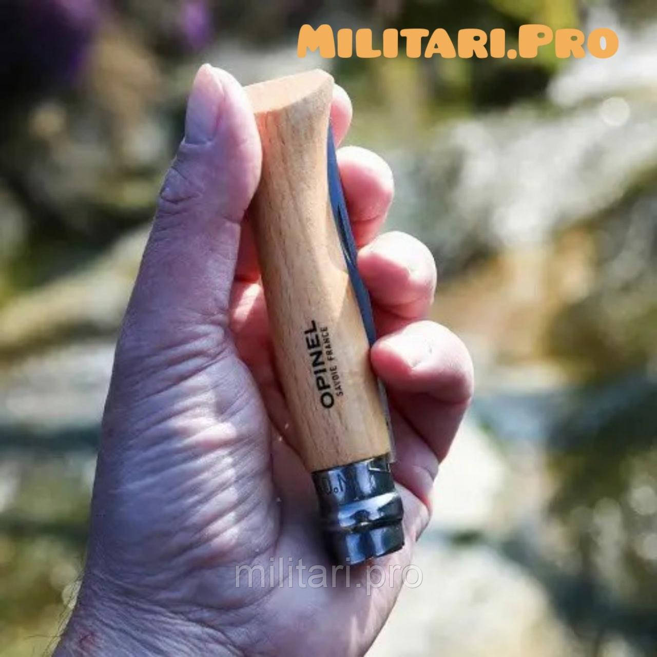 Ніж Opinel Inox №9 має дерев'яну рукоятку з міцного бука, покриту антиковзним шаром. Це забезпечує вам комфортний і безпечний захват, що особливо важливо при точній роботі. Завдяки своїй компактності та легкості (вага всього 58 грамів), цей ніж завжди зможе бути під рукою – вдома, на природі чи в поході.